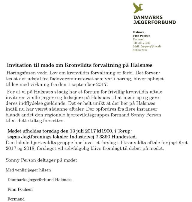 For yderligere oplysninger er man velkommen til at rette henvendelse til undertegnet. På Vegne af Jægerråd Halsnæs. Med venlig Hilsen Finn Poulsen Jægerråds formand Direkte tlf. 28121029 E-mail finnpou@live.dk